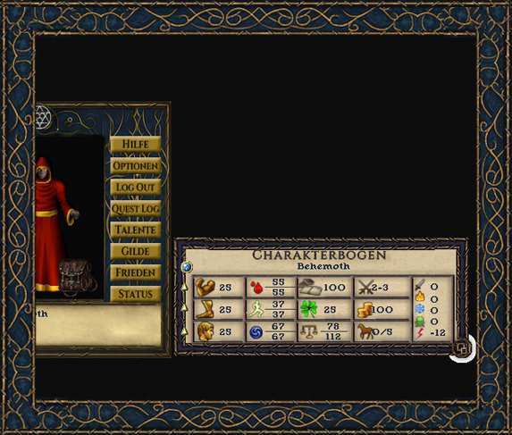 Ebenso wichtig ist eine übersichtliche Zusammenfassung der Werte deines Charakters – Hierfür kannst du durch einen Klick auf die “Status”-Taste in deiner Paperdoll den sogenannten “Charakterbogen” öffnen. Hier werden alle Zahlenwerte deines Charakters in einer Zusammenfassung angezeigt. Welcher Wert hierbei was symbolisiert, kannst du durch ruhiges Halten des Mauszeigers über das jeweilige Symbol schnell herausfinden.