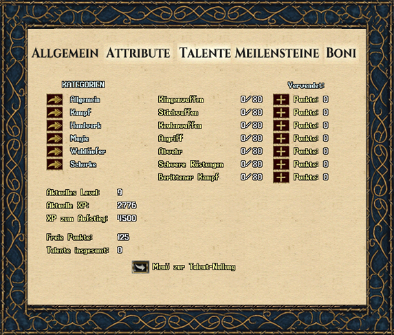 Die Seiten “Attribute” und “Talente” bieten dir eine Übersicht und Information der vorhandenen Talente. Hältst du den Mauszeiger ruhig über die Plus-Taste rechts neben dem Talent oder Attribut, erscheint ein informatives Tooltip, das die wichtigsten Eckpunkte und Informationen enthält. Möchtest du ein Talent steigern, benötigst du sogenannte “EP” (Erfahrungs-Punkte). Mit einem Klick auf das +-Symbol kannst du ein Talent nach Wunsch steigern, und wenn du mit deiner Wahl zufrieden bist, kannst du sie mit einem Klick auf “Änderungen speichern!” bestätigen, und das Talent wird gesteigert.