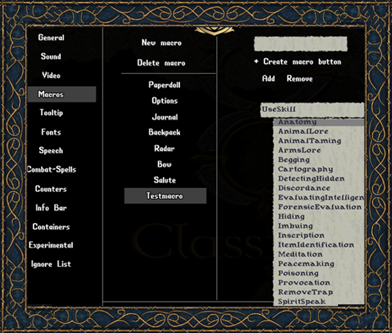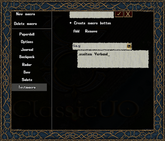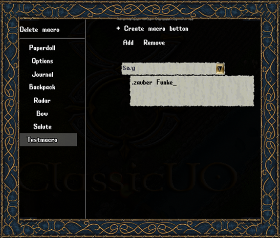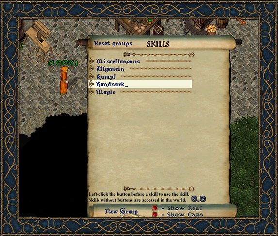 Ein weiteres, wichtiges Menü ist das sogenannte Journal, oder Tagebuch, das dir den Verlauf der lesbaren Meldungen in deinem Spielbereich aufzeigt. Hier wird nicht nur Gesprochenes angezeigt, sondern auch Systemmeldungen festgehalten, damit du jederzeit nachlesen kannst, was um dich herum geschieht. ClassicUO bietet hierbei ein erweitertes Journal mit schwarzem Hintergrund, das du auch beliebig breit und lang ziehen kannst. Du findest dieses unter “Optionen” in deiner Paperdoll.