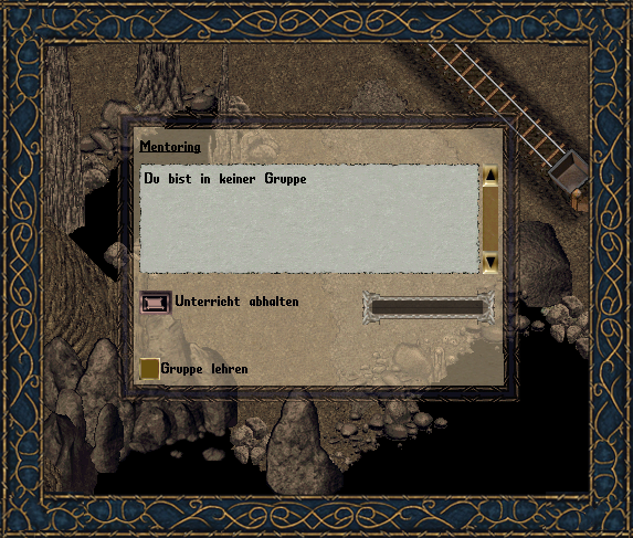 Das Mentorensystem stellt das Zentrum aller Lern- und Lehrfunktionen dar. Jede Zauberformel, jedes Rezept und jede Spezialattacke können mithilfe dieses Systems an Schüler und Interessierte weitergegeben werden, ohne dass ein Abschreiben notwendig wäre. Um das System zu benutzen, musst du dich mit deinem Schüler in einer Gruppe (“Party”) befinden und dann über einen Klick auf “Mentor” das zugehörige Menü aufrufen. In diesem Menü kannst du den Unterricht starten und auswählen, was du deinem Schüler beibringen willst. Solange du dich in der Nähe deines Schülers aufhältst und dabei aktiv RP betreibst, läuft das Lernen ganz automatisch ab.