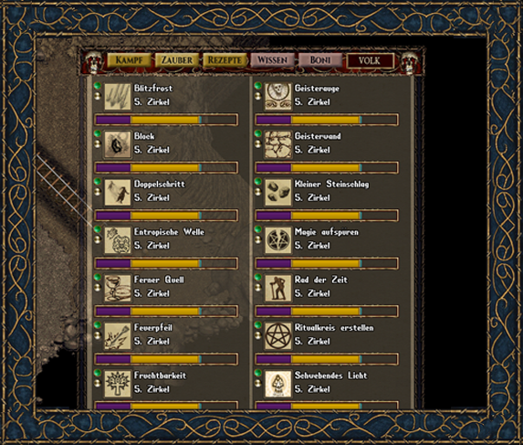 Im Reiter „Zauber“ werden alle bekannten Zauber angezeigt.